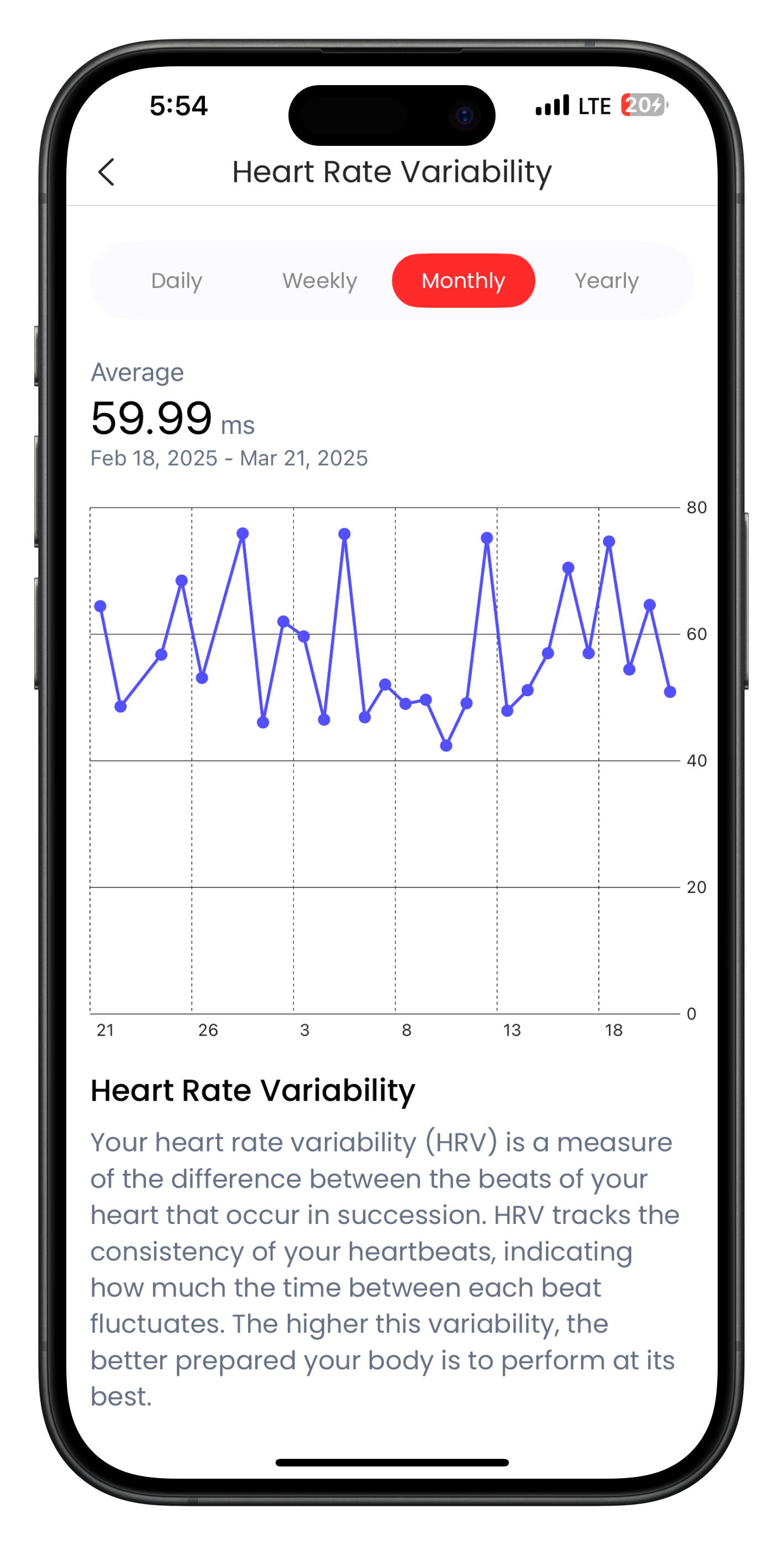 Monitor your heart rate trends, HRV changes, and resting heart rate over time to gain deeper health insights.